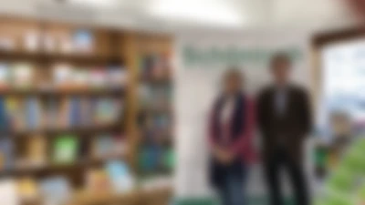 Bildunterschrift: Lucia Rühling, Projektleiterin Würzburger Bildungsfonds und Kuratorin der Bürgerstiftung mit Inhaber Adolf Wolz jun. in der Buchhandlung Schöningh in Würzburg. (Foto: Buchhandlung Schöningh)